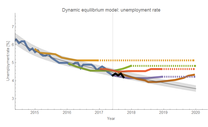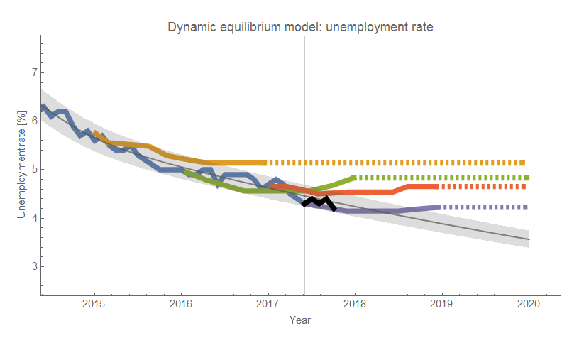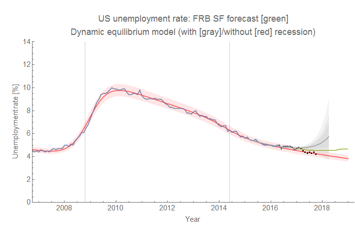 New unemployment data is out, so it's time to check to see how the forecasts are doing compared to reality. First, I want to throw out two forecasts as rejected: one from me, and one from the FRBSF. I started putting them on the same graph with the dynamic equilibrium model here, but the original forecast of mine was made as part of my effort to come up with way to forecast recessions. With what I know now, I wouldn't have made this forecast — the tolerance for positing a recession was too low and would have choked on earlier data if used in this model.