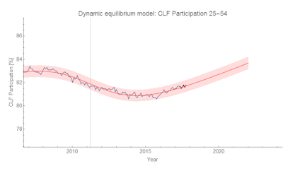 See here for more about that graph. It was also consistent with a "fading" Phillips curve. While I was thinking about the unemployment model today, I realized that the Phillips curve might be directly connected with women entering the workforce and the impact it had on inflation via the employment population ratio. I put the fading Phillips curve on the dynamic equilibrium view of the employment population ratio for women: