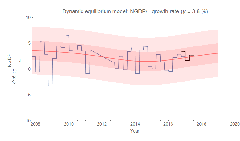 New NGDP numbers are out today for the US, so that means I have to check several forecasts for accuracy. I would like to lead with a model that I seem to have forgotten to update all year: dynamic equilibrium for the ratio of nominal output to total employed (i.e. nominal output per employed, as I write N/L):