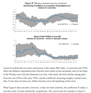 Janet Yellen in her Fed briefing from last week said "Our understanding of the forces driving inflation is imperfect." At least one aspect that's proven particularly puzzling is the relationship between inflation and unemployment: the Phillips curve. In an IMF working paper from November of 2015, Blanchard, Cerutti, and Summers show the gradual fall in the slope of the Phillips curve from the 1960s to the present. I discussed it in January of 2016 in a post here. A figure is reproduced below: