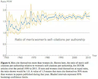 A recent study showed that men self-cite more often that women in academic journals, but the interesting aspect for me was that this appears to increase right around the time of women entering the workforce: