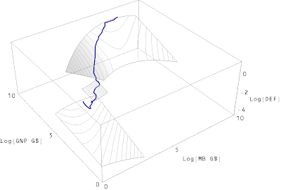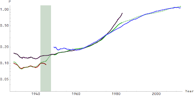 This all means we need to use different models to form the complete story. We have P:NGDP→MB with market MB before WWII, statist MB during WWII and a return to market MB after WWII. In the graph below, I fit the models to the data before (red) and after (blue) WWII (from this post). The new result is adding the piece in the middle using the accelerating inflation model (purple):