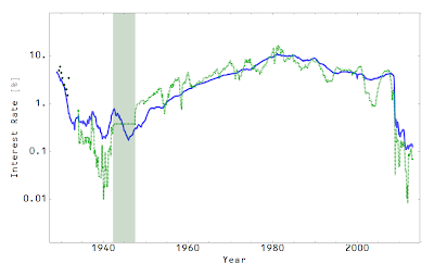 I updated the graphs at this link. It doesn't change any of the conclusions, so I'll leave this post unchanged.In the last post I mentioned that I would look at accelerating inflation as a potential way to exit from a liquidity/information trap. First let me start with interest rates. The information framework describes the effective fed funds rate very well from the 1960s onward. In order to look at even earlier times, I looked at the 3-month interest rate instead (which is approximately equal to the Fed funds rate, and is shown in green) and added a few points I managed to get from a Fed paper on the Depression for the years 1929-1931 (green dots). Even without re-fitting the data to the entire 1929-2013 period (fit only to 1960-2013), I got a remarkable fit: