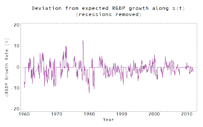 The picture that Sumner provides is similar, except the axes are the change in MB and the change in NGDP instead of interest rate and inflation rate. Again we have a situation where the same increase in the monetary base can lead to different changes in the price level, which for a constant increase in RGDP (going from the solid to dashed blue line) means different increases in NGDP. One thing to note is that Australia is not at the bottom of the U-shaped curve as Sumner suggests, but is actually on the right side. Additionally Zimbabwe is actually described by a different model (accelerating inflation), but can be approximated by the right side of Sumner's curve in the short run.