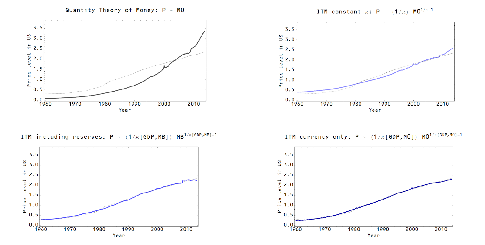 First, here are the model fits to the price level (clockwise from top left: QTM, ITM constant κ [1], ITM M0 and ITM MB):