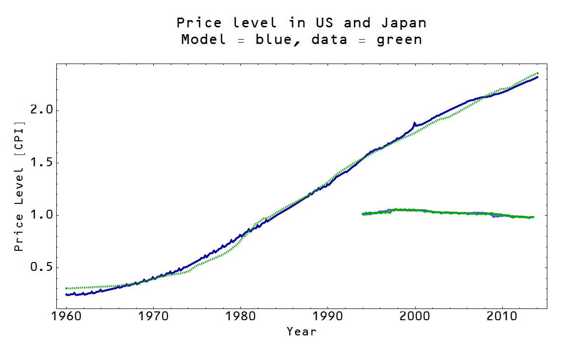 Note the red circles: the information transfer model seems to be overstating the amount of disinflation/deflation that is actually occurring in a rather systematic way. This is what disturbed me and so I decided to look at just the currency component of the base. This appears to do much better with the price level. Here for example are the Japan and the US model calculations using the currency component (sometimes referred to as M0):