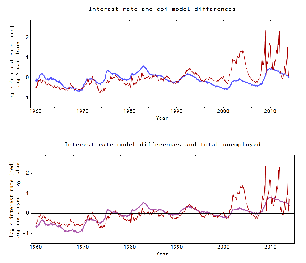 In the bottom graph (purple), I have a simpler model log U - z0 instead of the CPI model differences which seems to work as well if not better. Both the simpler unemployment model and the CPI unemployment model miss the big fluctuation in the interest rate market in the mid 2000s and I believe we are seeing zero-bound related effects in the interest rate market post-2008.