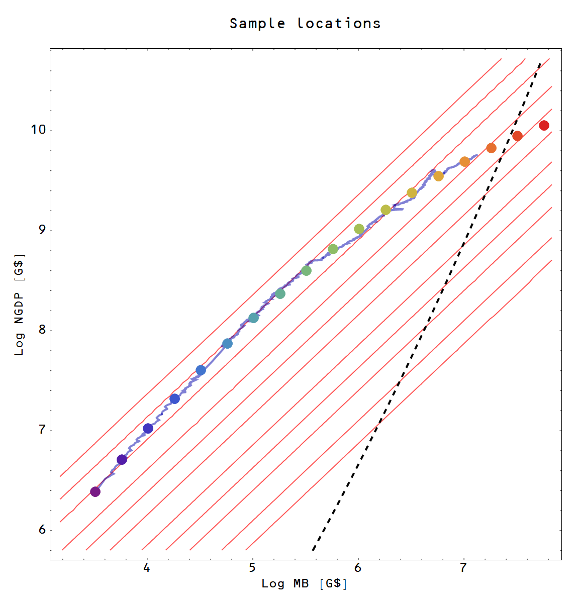 I started from this post and looked at the effect of monetary expansion (red arrows in the graph on the left below) on the interest rate (red lines). The model also incorporates the impact of monetary expanion on the price level -- it's a highly nonlinear system. The "information trap" criterion ∂P/∂MB = 0 is represented as a dotted line. At this line is where monetary policy has no impact on the price level or nominal output -- effectively the liquidity trap Krugman describes in his 1998 paper. I sampled points given by the rainbow dots in the graph below on the right (and the colors correspond in the rest of this post as well).