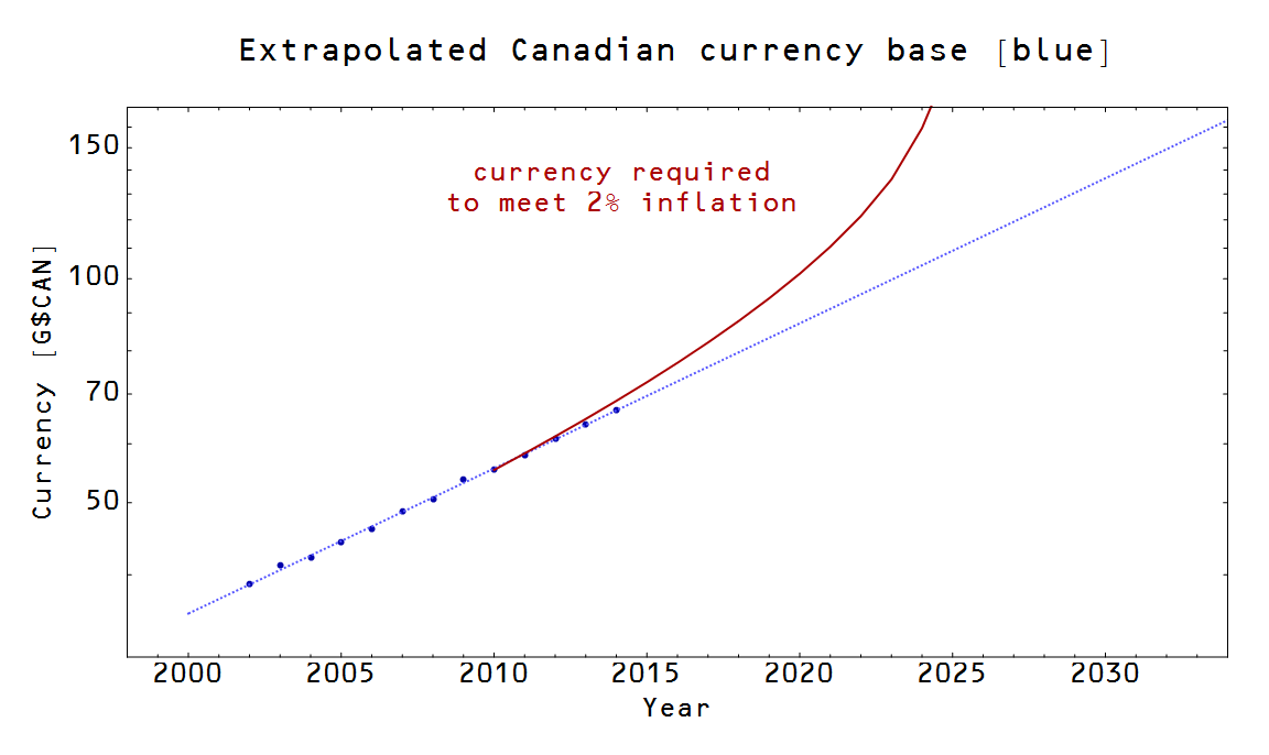 I'm going to put forward a prediction, using the information transfer model, that Canada will either undershoot its inflation targets or will have produced significantly more currency than the current log-linear trend.
