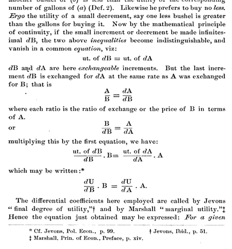 Fisher looks at the exchange of some number of gallons of $A$ for some number of bushels of $B$ and states: "the last increment $dB$ is exchanged at the same rate for $dA$ as $A$ was exchanged for $B$". Fisher writes this as an equation on page 5 (see picture above, added 7/13/15):