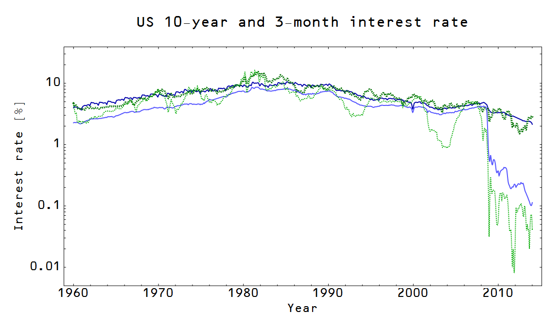 Let's say we have two markets rl:NGDP→M0 and rs:NGDP→MB with the same information transfer index (κ) where rl is the long run interest rate (10 year treasury rate) and rs is the short run interest rate (3 month rate). I fit κ to the 10 year treasury rate rl:NGDP→M0 and then looked at how well the MB data fit the 3-month rate in the same function:
