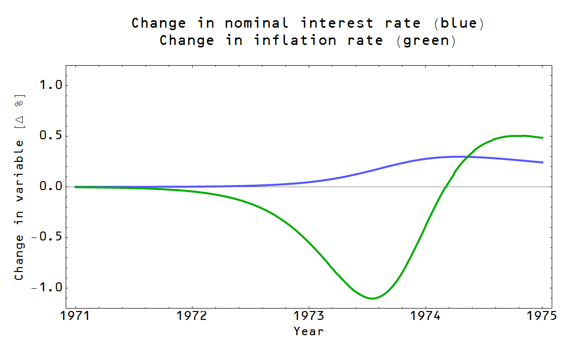 One of the graphs from that post is at the top of this post. Of course, as I mention in the post on Williamson, something gets in the way: the fact that there is no stable result with a permanent increase in interest rates. Guess what Cochrane' second consideration is?