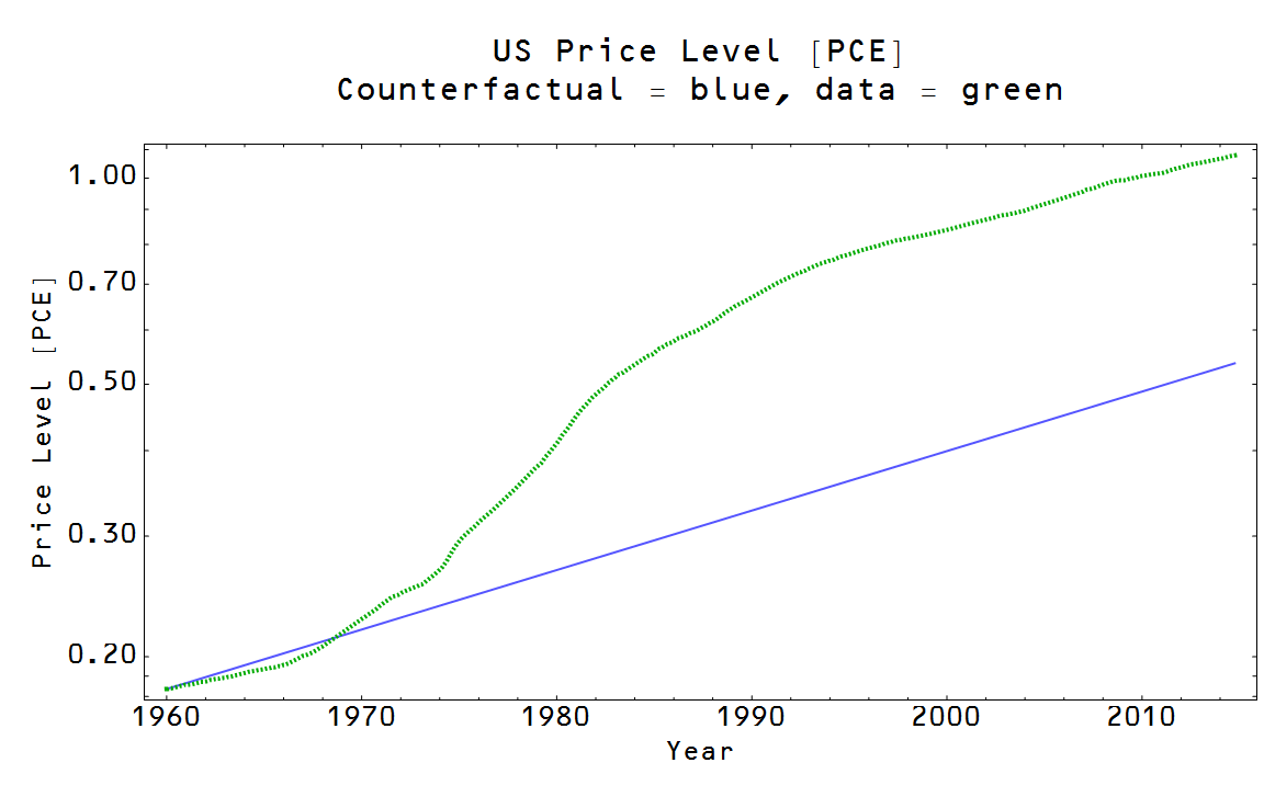 I made a counterfactual economy -- one with a 2% inflation target from 1960. Here are the results for PCE inflation (exactly 2% inflation), the currency base and NGDP: